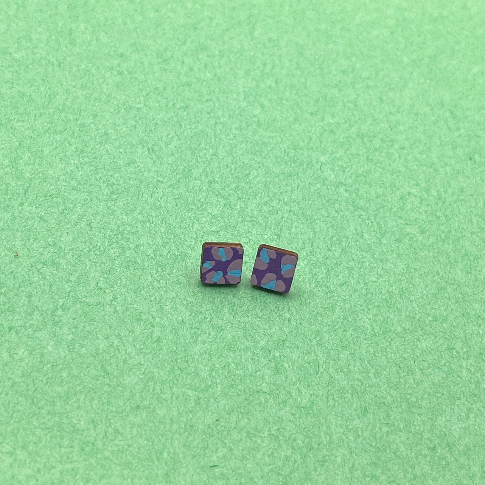 Small rounded square stud earrings, hand-painted in blue and purple.