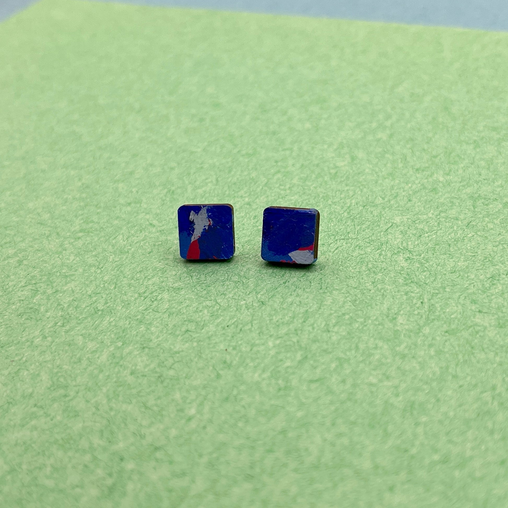 Small rounded square stud earrings, hand-painted in blue and pink.