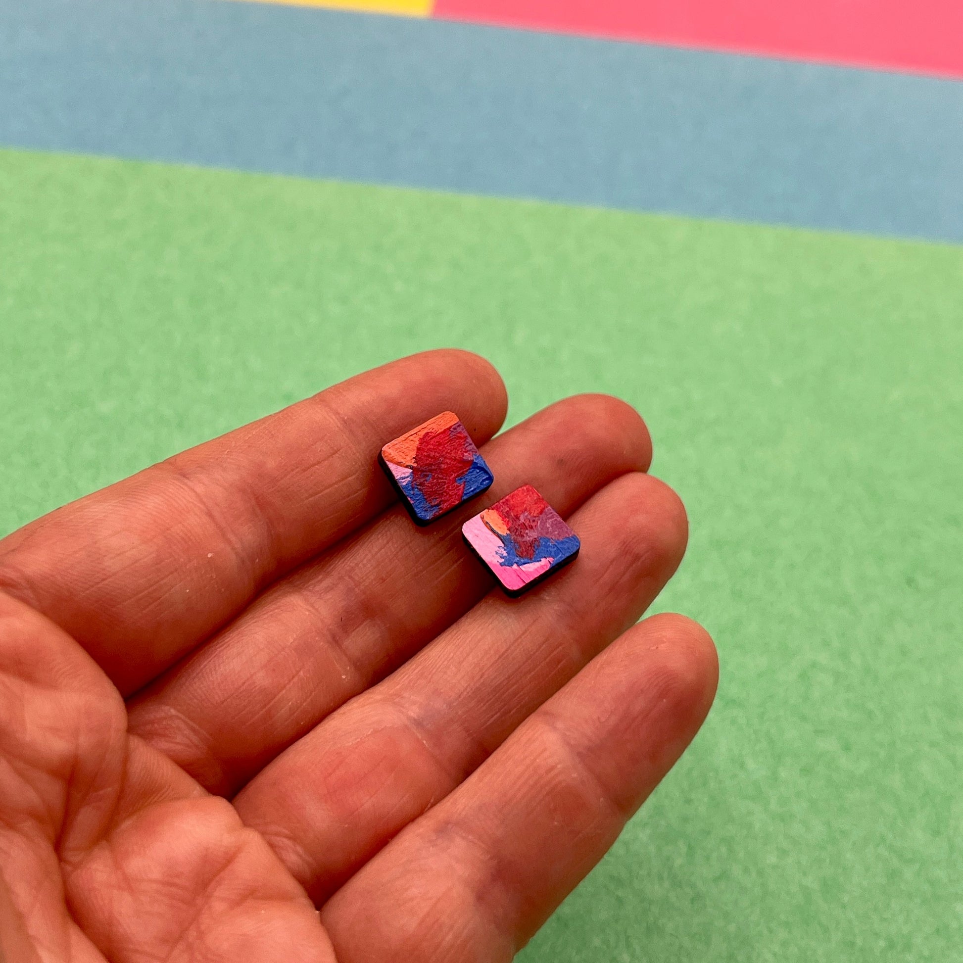 Small rounded square stud earrings, hand-painted in blue, orange, red and pink.