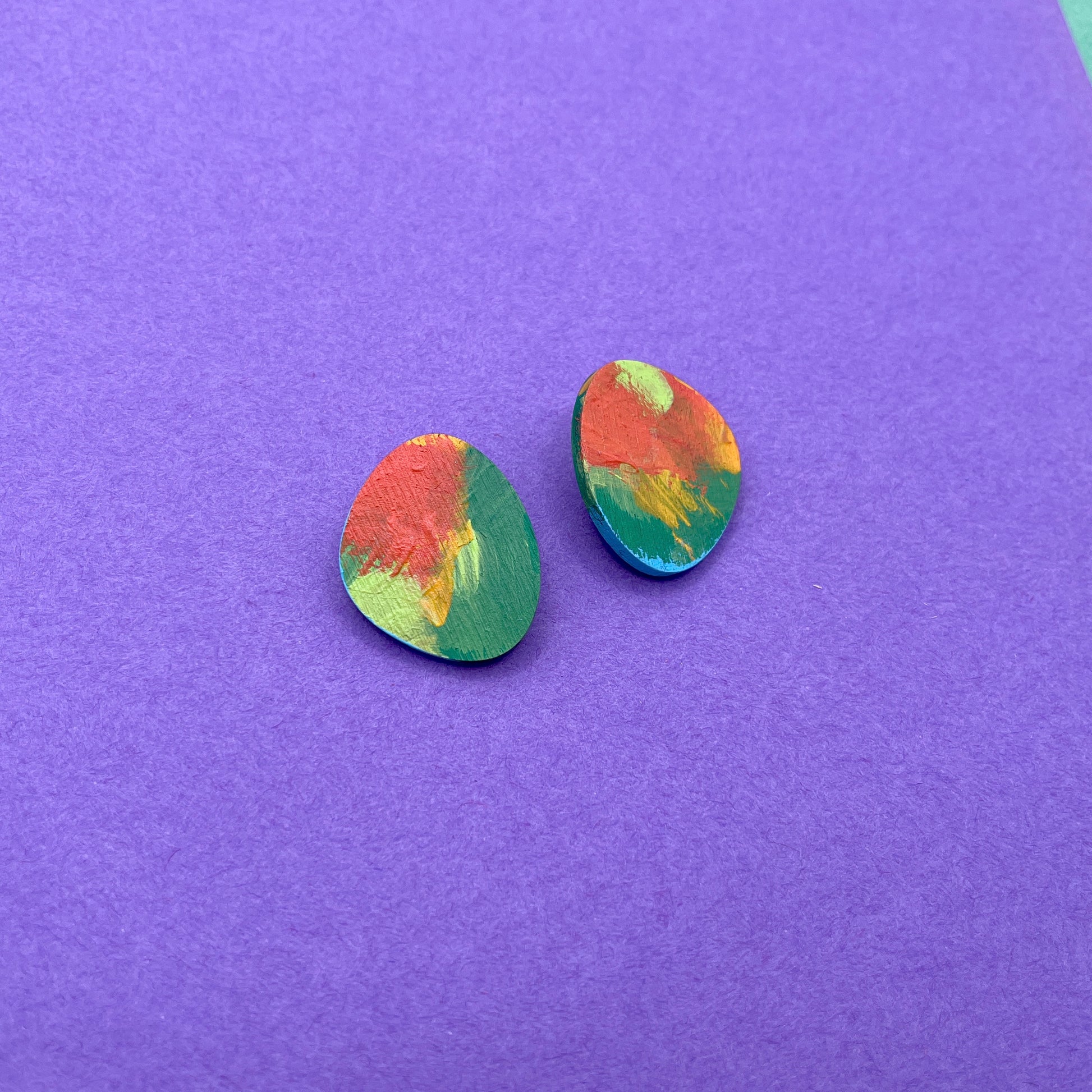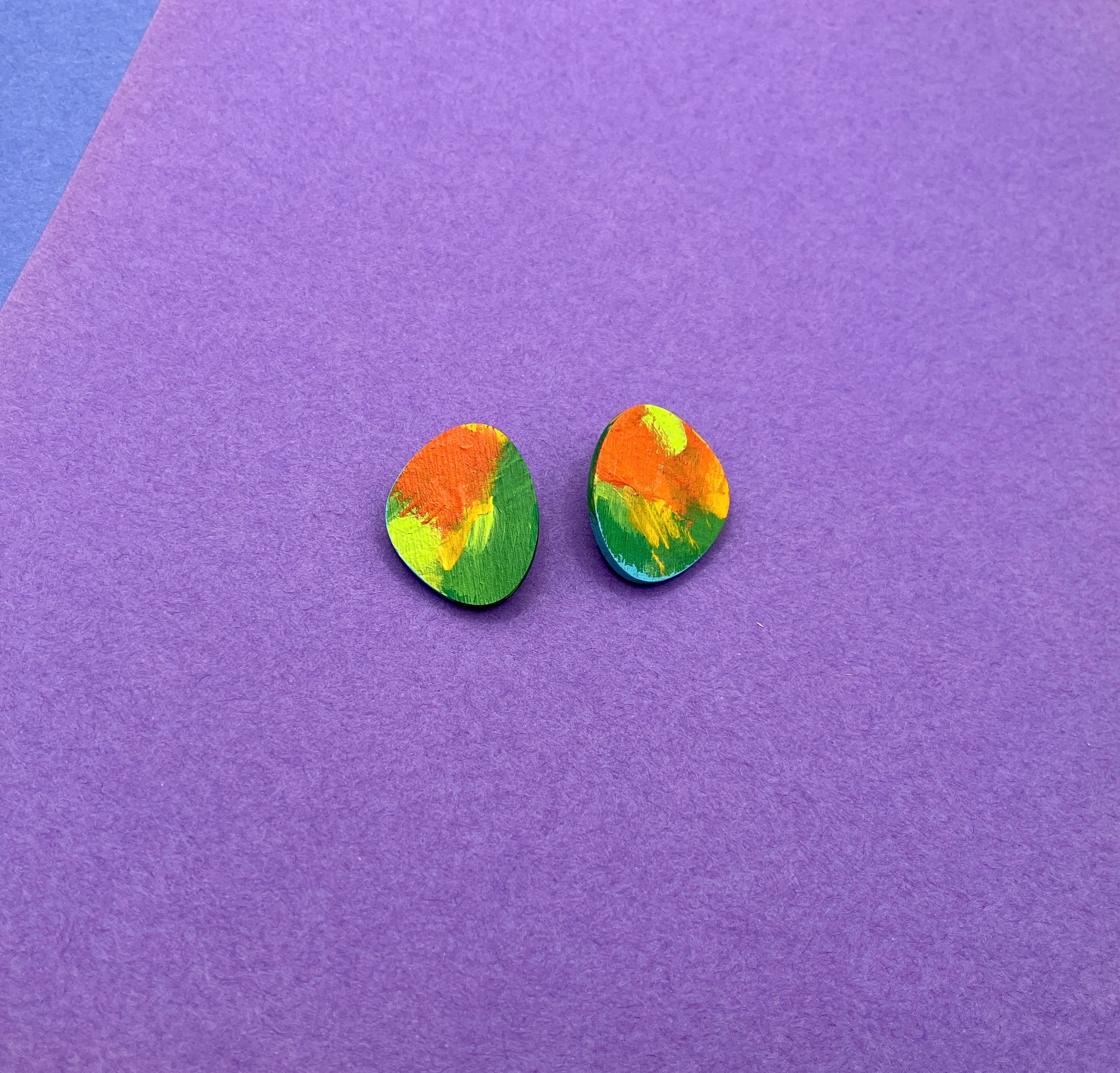 Big stud earrings, hand-painted in green, orange, yellow, and blue.
