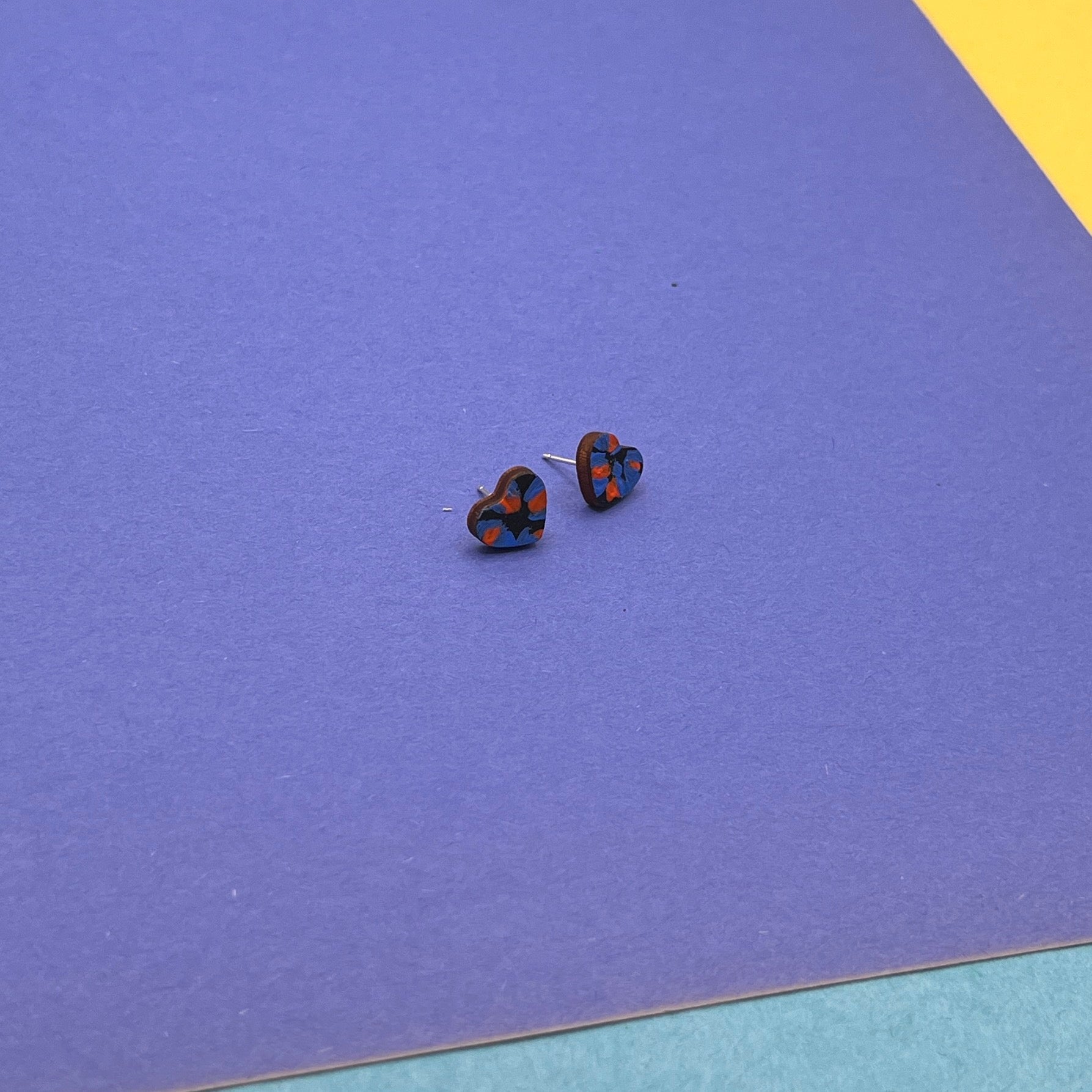 Small heart-shaped stud earrings, hand-painted in black, blue and orange.