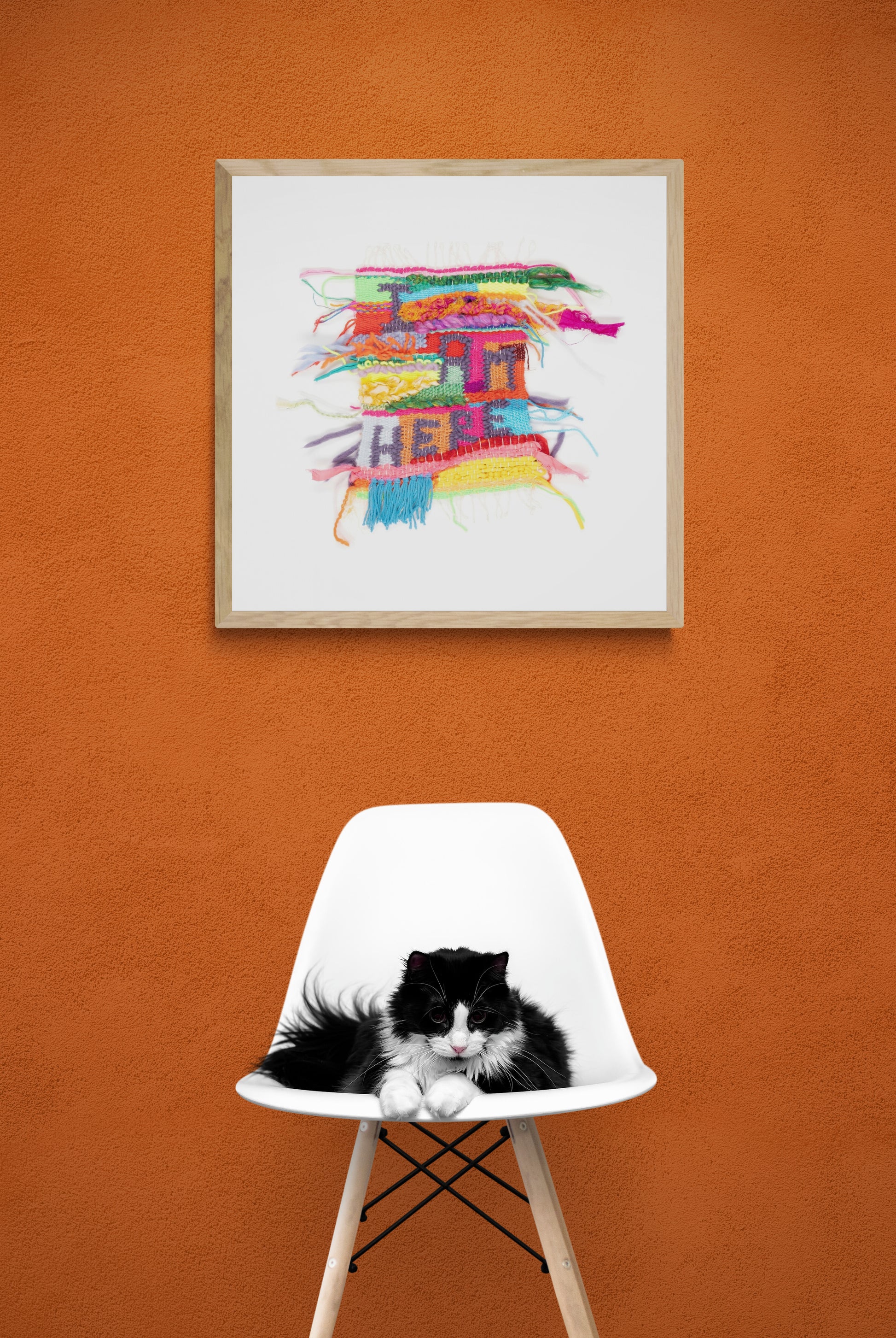 The powerful words "I AM HERE" are woven into the design, with the ends of the yarns and fabrics on display around the piece like a firework. I wanted to communicate that you, the whole you, is welcome. Even the messy parts that are usually hidden away so you can feel more palatable.