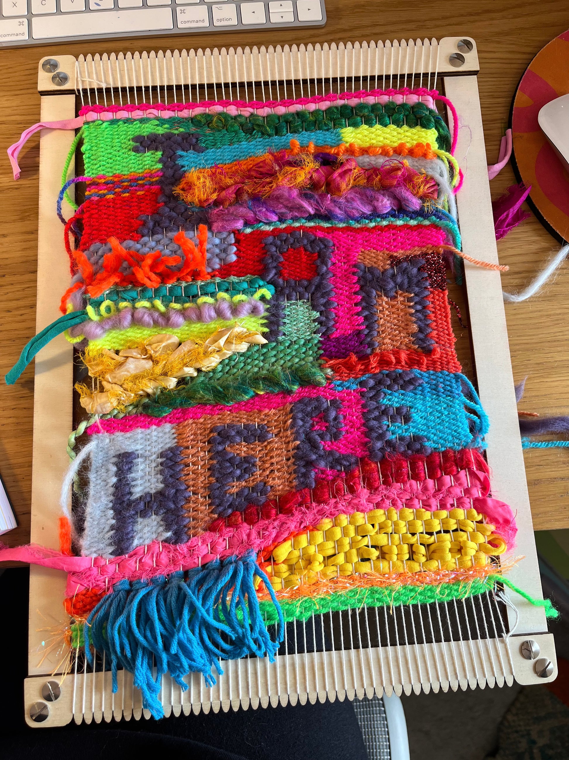 Rather than being tidied away, the ends of the yarns, threads and roving are displayed around the weaving like a firework! Let's celebrate ourselves; even the messy parts.
